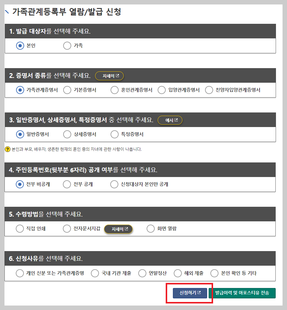 가족관계증명서를 인터넷으로 발급받는 방법은 매우 간단합니다. 대법원 전자가족관계등록시스템에 접속하여 신청/출력하면 됩니다. 24시간 언제든 이용할 수 있어 매우 편리하니 주민센터가 닫혀있다고 걱정하지 마세요.
